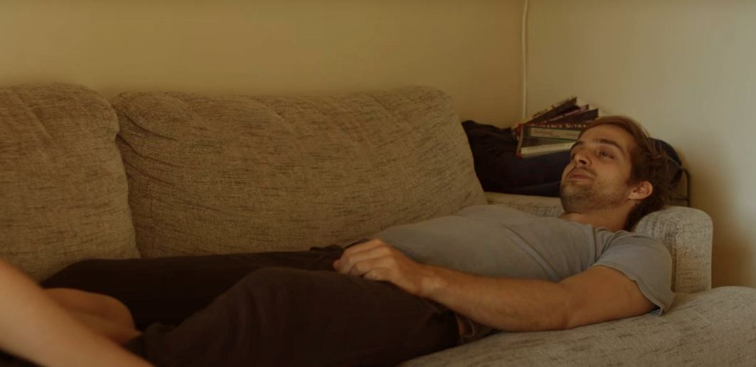 Tyler then confronts Claire about his suspicion. At 1:11:08, he keeps looking at the book from time to time, nervous because he’s about to confront his girlfriend. But his gaze becomes laser focused on her once he catches her lying. At 1:12:57 while his tone is even before, the voice gets higher as he becomes worked up, especially when a particularly sensitive point is brought up. In the end, Claire confronts his insecurity and leaves.